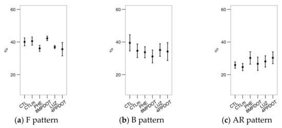 When analyzing the Ca2+ patterns with the CTC stain (Figure 4), it was found that PHE and 4P-PDOT, respectively, decreased (p < 0.05) the F (uncapacitated) and the B (Figure 4b, capacitated) patterns compared to the control. Differences were observed between treatments, with a slight increase in the B pattern with PHE compared to antagonist treatments (LUZ and 4P-PDOT) but non-significant compared to the control and CTLm. There were no additional effects on the AR pattern of melatonin or its agonists or antagonists. Nevertheless, the combined results for F and B suggest a combined functionality of MT1 and MT2 on the Ca2+ distribution during the capacitation process.
