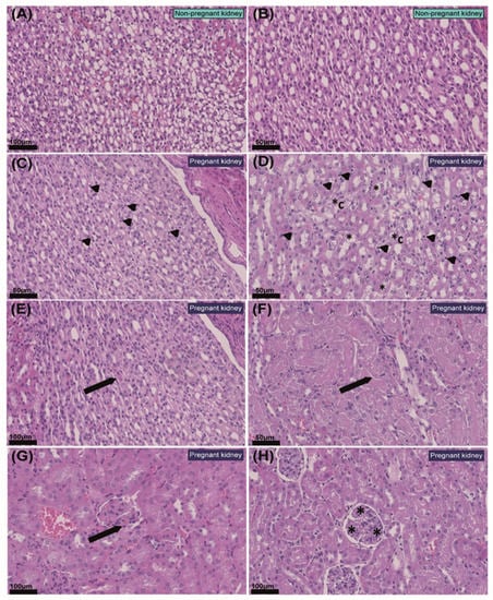 Histopathological changes in the kidney in response to pregnancy in mice. (A,B) Representative images of non-pregnant renal medulla. (C) Renal medulla of pregnant mouse with mildly increased numbers of interstitial cellular constituents (arrow heads). (D) Renal medulla of pregnant mouse with moderately increased numbers of cells within the interstitium (arrow heads), distal tubule epithelial degeneration (*) and collecting duct epithelial degeneration (*C). (E) Protein casts within proximal tubules with mild degeneration in the renal cortex of a pregnant mouse (arrow). (F) Protein casts within distal tubules in renal medulla of a pregnant mouse (arrow). (G) Segmental thickening of the glomerular basal membrane in pregnant kidney (arrow). (H) Mild glomerular splitting in pregnant kidney (*). Values of scale bars are shown in the images.
