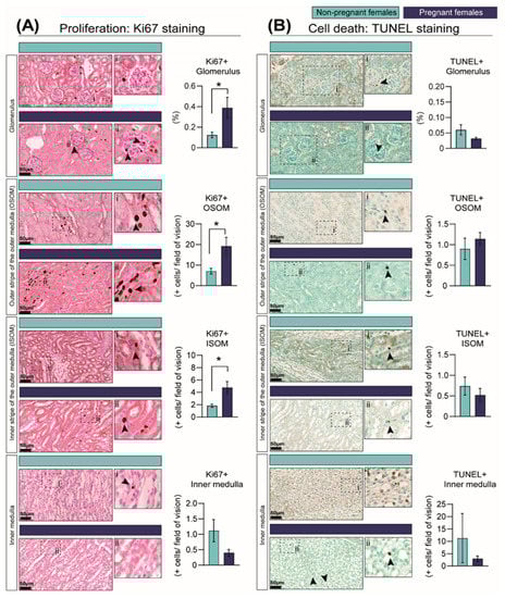 Percentage of cells showing cell-cycle activation as informed by Ki67 immunostaining (A) and cell death as identified by TUNEL assay (B) in the kidney in response to pregnancy in mice. Representative image of stained kidney from non-pregnant and pregnant female mice. Data are presented as mean ± SEM (n = 5/group). Asterisks represent significant differences between non-pregnant and pregnant mice as determined by Student’s t-Test (* p < 0.05). Images with the labels i and ii depict high magnification of the selected area. Arrow heads indicate positive DAB staining. Scale bar is 50 µm.