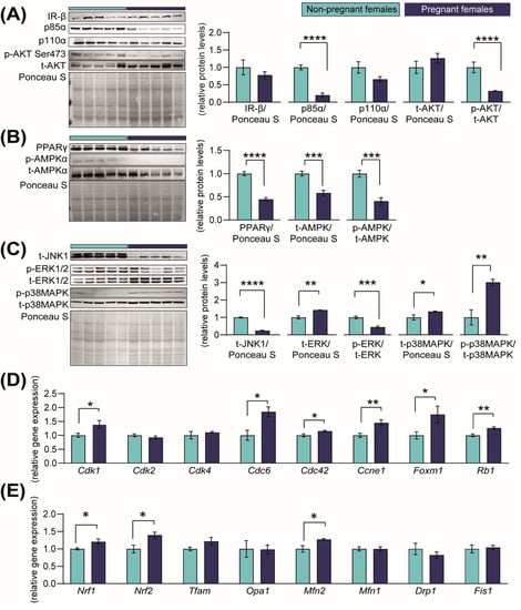 Abundance of proteins in growth-signalling pathways and expression of cell-cycle regulatory genes in the kidney in response to pregnancy in mice. (A–C) Immunoblots and quantification of PI3K-AKT, PPAR-AMPK and MAPK-JNK signalling proteins in the kidneys of non-pregnant and pregnant female mice (n = 5/group) (D,E). Expression of genes related to cell-cycle progression and mitochondrial-related genes in kidneys of non-pregnant and pregnant female mice (n = 4–5/group). Data are presented as mean ± SEM and were analysed by unpaired Student’s t-test. Asterisks represent significant differences between non-pregnant and pregnant mice (* p < 0.05; ** p < 0.01; *** p < 0.001; **** p < 0.0001).