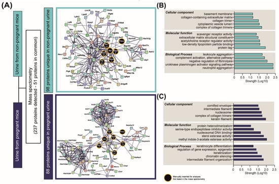 Urinary proteins detected in non-pregnant and pregnant mice. (A) Results of the analysis of proteins detected by mass spectrometry in urine samples (n = 3/group). (B,C) Top-scoring cellular, molecular and biological processes for the 98 and 88 proteins uniquely detected in non-pregnant and pregnant urine, respectively. Network representation and pathway analysis were performed with STRING.