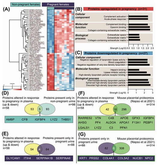 Changes in the abundance of plasma proteins in response to pregnancy in mice. (A) Heat map of differentially expressed plasma proteins between the pregnant and non-pregnant mice, as detected by mass spectrometry (n = 3 non-pregnant and n = 8 pregnant). (B,C) Top-scoring cellular, molecular and biological processes for the 31 and 27 proteins upregulated and downregulated in pregnant mice, respectively. Analysis performed with STRING. (D) Venn diagram showing the overlay of proteins altered in plasma in response to pregnancy (upregulated and downregulated) with the proteins exclusively detected in the non-pregnant urine. (E) Venn diagram showing the overlay of altered proteins in plasma in response to pregnancy (upregulated and downregulated) with the proteins exclusively detected in the pregnant urine. (F) Venn diagram showing the overlay of altered proteins in plasma in response to pregnancy (upregulated and downregulated) with proteins previously reported to be secreted by the mouse placenta [41]. (G) Venn diagram showing the overlay of proteins detected in the pregnant urine with proteins previously reported to be secreted by the mouse placenta [41].