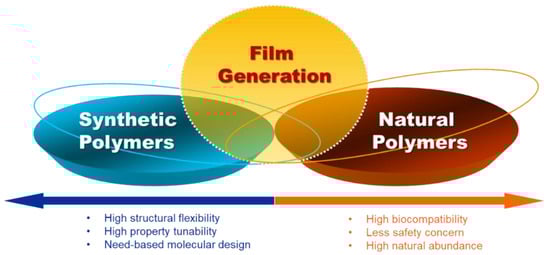 Selection of polymers is pivotal when a packaging film is designed. One major group of polymers that have been widely exploited in film fabrication is natural polymers, who show natural abundance and high sustainability (Figure 1). They can help reduce the use of petroleum resources, and reduce problems led by environmental pollution. Natural polymers adopted for film generation include chitosan [34,35], starch [36], and cellulose [37]. Recently, fruit purées have been exploited for film making. For instance, edible films containing cinnamaldehyde nanoemulsions have been generated from pectin and papaya purée and have been reported to show antibacterial properties against Staphylococcus aureus, Salmonella enterica, Escherichia coli, and Listeria monocytogenes [38]. More recently, a biodegradable and edible packaging film has been developed by using papaya purée. During film fabrication, papaya purée is added to distilled water containing starch, followed by heating at 75 °C for 30 min to obtain a film-forming solution. Upon the addition of glycerol as a plasticizer, a film is generated via solution casting [39]. To enhance the performance of the film in food packaging, gelatin and defatted soy protein have been incorporated. Such incorporation has been shown to lead to an enhancement in elongation at break and a decrease in water solubility [39].