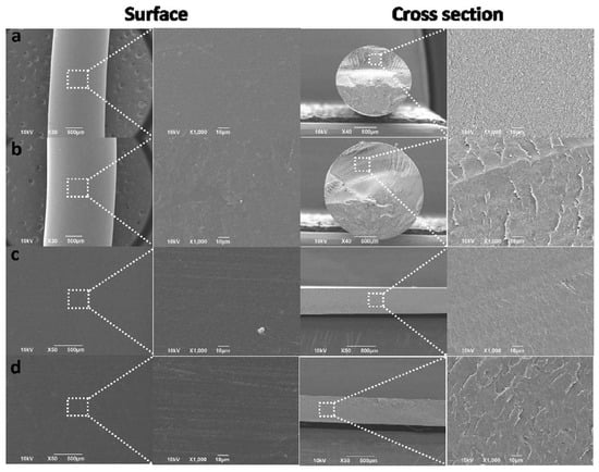 Surface and cross-sectional morphologies of the (a) pure LDPE filament, (b) curcumin-loaded LDPE filament, (c) pure LDPE film, and (d) curcumin-loaded LDPE film. Adapted with permission from [48], 2019, Elsevier B.V.