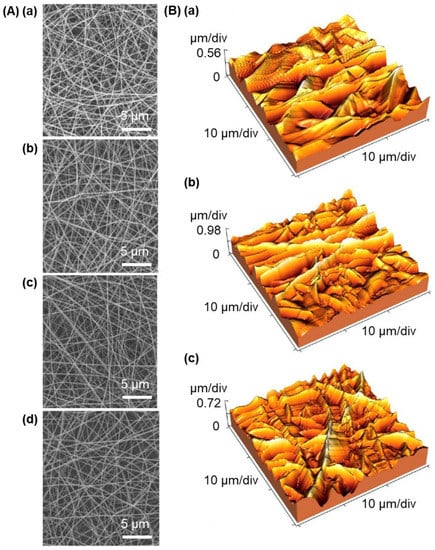 (A) Scanning electron microscopy images of electrospun nanofiber mats consisting of chitosan and PVA and being loaded with different concentrations of protein hydrolysates: (a) 0 mg/mL, (b) 1 mg/mL, (c) 3 mg/mL, and (d) 5 mg/mL. (B) 3D atomic force microscopy images of electrospun nanofiber mats consisting of (a) PVA alone, (b) PVA and chitosan, and (c) chitosan, PVA as well as protein hydrolysates. Adapted with permission from [56], 2019, Elsevier B.V.