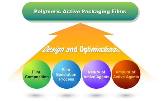 Despites the promising potential as mentioned above, packages generated from polymers are highly permeable to gases and other low-molecular-weight compounds. This reduces the effectiveness of these food packages to serve as a passive barrier to combat the adverse effects caused by the surrounding to the packaged food. To tackle this problem, one strategy is to control the atmosphere inside the food package by putting a sachet of chemicals (e.g., ethylene scavengers, carbon dioxide emitters, oxygen scavengers, and humidity adsorbers) inside the package [18]. This approach greatly enhances the efficiency of the polymer-generated package to extend the shelf life of the food product even without the use of additional complex technologies and film modification [18]. However, the chemicals used inside the sachet are often non-consumable. Accidental release of these agents from the sachet to the food causes safety concern [19,20,21,22]. An alternative to this approach is the incorporation of active agents into polymer-generated packages. This approach of active packaging, in which the package interacts actively with the environment and/or the food during food preservation, has drawn extensive interest over the last several decades [18]. Until now, different polymer-generated active food packaging films have been developed [23,24,25,26,27]. While multiple articles have already been published to review the latest advances in the development of these films [28,29,30,31,32,33], efforts devoted to presenting the current understanding of the process of film design are scant. This review fills this gap by revisiting various major factors and strategies known to be important for an active food packaging film to be properly designed, produced, and optimized. It is anticipated that this review will help lay a theoretical and practical foundation for further development of more effective films for active food packaging.
