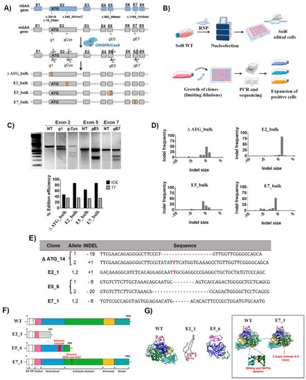 Generation of isogenic murine cellular models in Sol8 cells with severe Pompe mutations. (A) Scheme of the strategy designed to generate murine Sol8 cell Pompe models. These cellular models, ∆ ATG, E2, E5 and E7, resemble some mutations present in Pompe patients’ cells, such as c.3G>A and c.18_25del, c.340_341insT, c.982_988del and c.1199_1210del, respectively. These models were used to generate different protein modifications from no protein expression to different frame shifts generating aberrant proteins, or even deletions of critical amino acids at the catalytic site. (B) Representative scheme of the nucleofection process with RNP, cellular cloning and analysis of the cell clones for the selection of edited positive clones. Image created with BioRender.com accessed on 30 April 2022. (C) Editing efficiencies by CRISPR/Cas9 targeted at different exons in the murine GAA locus determined by the T7 assay and the ICE algorithm (see M&M). Top, T7EI assay of the Sol8 nucleofected cells (RNP g1-ATG, g Cys, gE5 and gE7) and NT (non-treated). Bottom, graph of the editing efficiencies in Sol8 cells nucleofected with RNP g1 (∆ ATG), g Cys (E2_bulk), gE5 (E5_bulk) and gE7 (E7_bulk) using the T7EI vs. ICE algorithm. (D) Graphs showing the profile of indels generated in Sol8 cells nucleofected (∆ ATG, E2_bulk, E5_bulk and E7_bulk), using the ICE algorithm. The coordinate zero represents the cut site, negative values represent deletions of different length and positive values represent insertions. (E) cDNA sequence in each Sol8 clone with different insertions and deletions compared with the WT Sol8 cells by ICE tool. The insertions are marked in red and the deletions as “–“. (F) Schematic representation of the different domains of mGAA WT, E2_1, E5_6 and E7_1 based on their homology with hGAA. (G) Murine GAA (WT, E2_1, E5_6 and E7_1) 3D structures predicted using SwissProt modelling. For 3D structure prediction of the different clones, we performed a translation of their sequenced mRNA using ExpasY and the structures were predicted with SwissProt modelling.