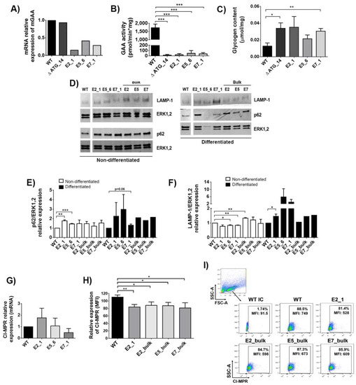 Characterisation of GAA-KO Sol8 cellular models. (A) mRNA relative expression of mGAA in the different Sol8 clones (∆ ATG_14, E2_1, E5_6 and E7_1) compared to WT cells. (B) GAA activity in Sol8 WT cells and mutated clones (∆ ATG, E2_1, E5_6 and E7_1). (C) Glycogen content in Sol8 myoblasts differentiated into myotubes (see M&M) in WT and clones (∆ ATG, E2_1, E5_6 and E7_1). (D) Western blot analysis of Sol8 cells lysates using anti-p62/sequestosome-1 (SQSTM1) and anti-LAMP-1 antibodies. Anti-ERK1,2 was used as a loading control. (E) Quantification of p62 levels normalised to ERK1,2. (F) Quantification of LAMP-1 levels normalised to ERK1,2. (G) mRNA relative expression of CI-MPRs in clones (∆ ATG, E2_1, E5_6 and E7_1) and Sol8 WT cells. (H) Surface CI-MPRs relative expression (mean fluorescence of intensity-MFI) in Sol8 WT compared to E2_1, E2_bulk, E5_bulk and E7_bulk. (I) Representative dot-plot of CI-MPRs expression (MFI) in Sol8 WT, E2_1, E2_bulk, E5_bulk and E7_bulk. Statistical analyses: unpaired t-test, two-tails (A–C), unpaired t-test one-tail (E–H) (* p < 0.05, ** p < 0.01, *** p < 0.001. Values represent means +/− SEM of at least 3 separate experiments.