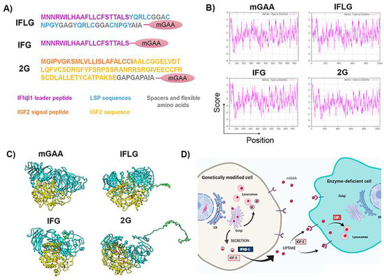 The hydropathicity pattern prediction using the Kyte–Doolittle scale in ExPASy [46,47] showed a very similar hydrophobicity pattern of the different mGAA chimeras compared to the original mGAA (Figure 3B). Additionally, a theoretical reconstruction of the different mGAA proteins using I-TASSER prediction, Pymol and Chimera software showed that all chimeric proteins preserved the domains involved in GAA activity without significant differences in the 3D structure of the GAA protein (Figure 3C). A scheme of the potential therapeutic advantages in the secretion and uptake of the different chimeric mGAA proteins for GT strategies can be seen in Figure 3D.