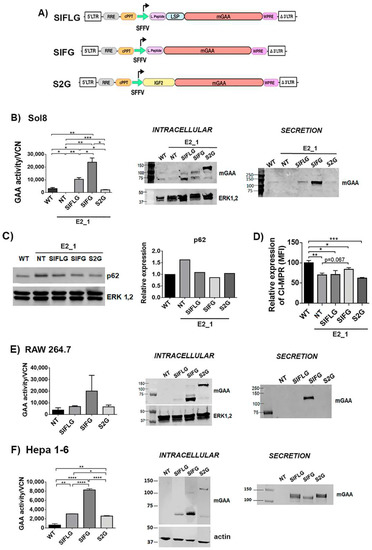 Optimisations of mGAA restore the GAA enzymatic deficit in GAA-KO cells, and it is secreted into the medium. (A) Schematic representation of SIFLG, SIFG and S2G constructs. mGAA, murine glucosidase alpha acid; SFFV, spleen focus forming virus promoter; WPRE, woodchuck hepatitis virus post transcriptional regulatory element. (B) Analysis of mGAA intracellular activity (left graph) in cell lysates (WT and NT) or after correcting by vector copy number (VCN) (SIFLG, SIFG and S2G). Middle panel and right panels: Western blots of intracellular (middle) or secreted (right) mGAA from Sol8 WT, E2_1 (NT) and E2_1 cells transduced with SIFLG, SIFG and S2G. (C) Western blot and quantification of p62 levels relative to ERK1,2 levels in WT, non-transduced E2_1 cells and transduced E2_1 cells with LVs. (D) CI-MPRs’ relative expression in rescued Sol8 GAA-KO cells (E2_1). E-F) Analysis of mGAA intracellular activity (left graph) in cell lysates (NT = WT non-transduced) or after correcting by vector copy number (VCN) (SIFLG, SIFG and S2G). Western blot of intracellular mGAA (middle panels) and secreted mGAA (right panels) of (E) RAW 264.7 cells and (F) Hepa 1-6 cells. Statistical analyses: B, E and F) unpaired t-test (two tails, * p < 0.05, ** p < 0.01, *** p < 0.001, **** p < 0.0001)). Values represent means +/− SEM of at least three separate experiments.