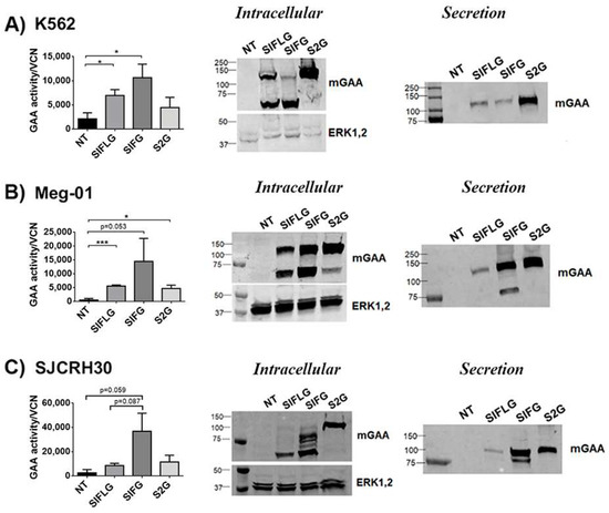 We were not able observe significant differences in intracellular alfa-glucosidase activity nor in GAA processing (left graphs and Western blot (middle panels) of Figure 5A–C) compared with murine cell lines (left graphs and Western blot (middle panels) of Figure 4B,E,F), since, in murine cells, both myeloid (Figure 5A,B) and muscle (Figure 5C) human cells transduced with the SIFG LVs achieved their highest intracellular activity in relation to their vector copy number (Table S3). Surprisingly, the secretion of the 2G protein (cells transduced with S2G LVs) was easily detected in all human cell lines (Figure 5A–C; Western blots, middle panels and Figure S6). In fact, this chimera presented the highest secretion level of all chimeras in human myeloid cells (K562 and Meg-01) and similar levels to the IFG protein in the human muscle cell line SJCRH30 (Figure S6). Therefore, these data suggest that the murine cellular models do not necessarily mimic the secretion profile of newly designed proteins in human cells.