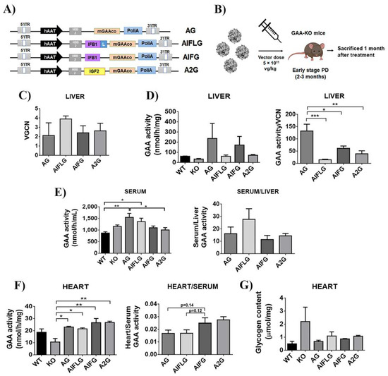 Mice were sacrificed one month after the injection, and the vector genome copy number (Figure 7C), as well as the GAA activity in the liver (Figure 7D) and serum (Figure 7E, left graph), were analysed to determine in vivo GAA expression and secretion activity for each of the constructs. As already reported [48], the unmodified-codon optimised GAA appears as the best performer in terms of expression in the liver (Figure 7D, right graph). However, modified GAAs were secreted with similar efficacy, as evidenced by normalising the GAA activity in serum versus GAA activity in the liver (Figure 7E, right). We next analysed GAA activity and glycogen content in the heart as an indicator of the ability of the different GAAs to cross-correct muscle tissue. As it can be observed in Figure 7F, left and Figure 7G, all chimeras appear to behave similarly, restoring physiological levels of GAA activity and reducing glycogen levels, although the IFG and 2G modified GAA seem to improve the uptake compared to wild-type GAA (AG) and AIFLG (Figure 7F, right).