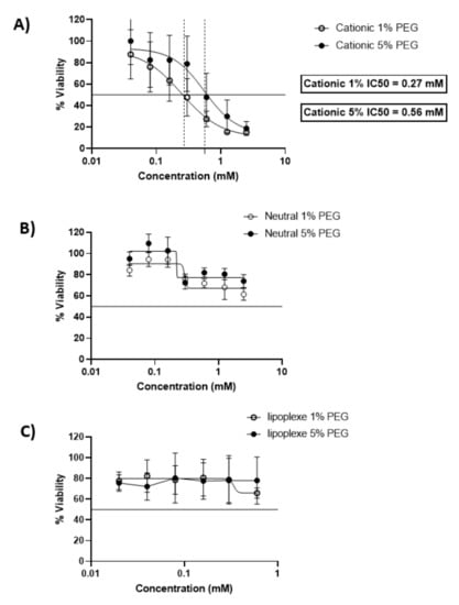 Dose-response curves expressing the viability of BeWo cells after incubation with cationic liposomes (A), neutral liposomes (B) and lipoplexes (C) for 24 h. The x-scale of the lipoplexes MTT (C) is different from the liposome graphs (A,B). The data represent the results of MTT assay and are expressed as average % cell viability ± SEM against the concentration of the liposomes in mM. Error bars indicate standard deviation for n = 3 formulations.