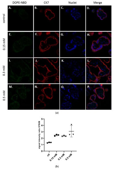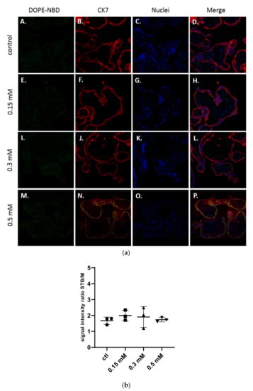 (a) Confocal images of term placental villi incubated with medium (A–D), and neutral liposomes (5 % DSPE-PEG2000) at various concentrations: 0.15 mM (E–H); 0.3 mM (I–L); 0.5 mM (M–P). Green: liposomes (DOPE-NBD); Red: syncytiotrophoblast (CK7); Blue: nuclei (DAPI); (b) Semi quantitative analysis of green fluorescence intensity ratio between the syncytiotrophoblast region and mesenchymal axis of placental villi analyzed with confocal microscopy and treated with neutral liposomes at different concentrations (n = 3 villi).