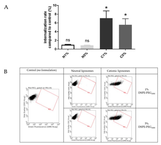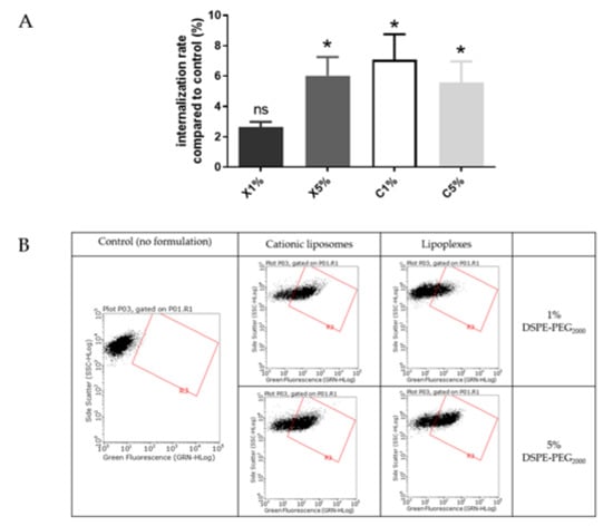 (A) Internalization study of cationic liposomes and lipoplexes (0.03 mM) containing 1% and 5% PEG. Internalization rates correspond to fluorescence from flow cytometry experiments relative to the control (cells incubated with medium only); data represent the mean ± SEM (n = 3); * indicates a significant difference compared to the control (p < 0.01, Mann-Whitney); (B) Flow cytometry dot plots for liposomes internalization evaluation (green fluorescence, DOPE-NBD) after incubation with fluorescent cationic liposomes and lipoplexes (1 or 5 % PEG) at 0.03 mM for 4 h. A minimum of 15,000 cells/samples were analyzed.