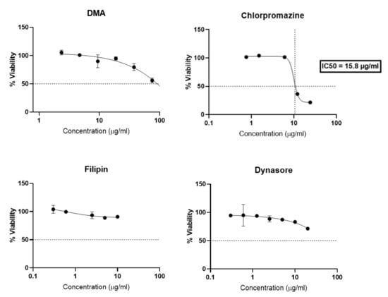 Compared to previous studies [25,26,27] the different endocytosis inhibitors have been specifically selected for trophoblast, as a matter of non-cytotoxicity, and concentrations and time selected for the assay were chosen based on a viability study (Figure 6). After 4 h of incubation with BeWo cells, chlorpromazine greatly reduced cellular viability with an IC50 of 15.8 µg/mL. DMA, Filipin and Dynasore showed less toxicity since filipin preserved 80% of cell viability, and DMA and Dyansore preserved 50% of cell viability for all concentrations tested. DMA and Dynasore allowed 80% cell viability at 10 µg/mL and 20 µg/mL respectively.