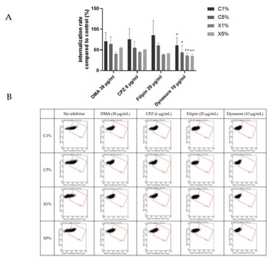 Results of the effect of endocytosis inhibitors on the uptake of cationic liposomes by BeWo cells. Internalization rates correspond to fluorescence from flow cytometry experiments relative to cells incubated with liposomes without inhibitors; data represent the mean ± SEM (n = 3 formulations), * indicates a significant difference compared to the control (p < 0.01, Mann-Whitney) and ** indicates a significant difference compared to the control (p < 0.001, Mann-Whitney); (B) Flow cytometry dot plots for liposomes internalization evaluation (green fluorescence, DOPE-NBD) after incubation with fluorescent cationic liposomes and lipoplexes (1 or 5% PEG) at 0.03 mM for 4 h with or without inhibitors dimethylamiloride (DMA), Chlorpromazine (CPZ), Filipin and Dynasore. (A) minimum of 15,000 cells/samples were analyzed.