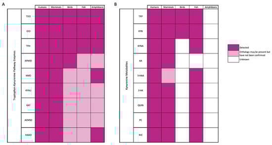 A review of kynurenine pathway (A) enzymes and (B) metabolites detected across animal kingdoms. If both gene and protein data was available, it was considered detected, and labelled dark pink. If enzymatic and metabolite orthologs may be present (via. computational curation of databases) but have not yet been confirmed in gene or protein levels, it was labelled light pink. If no information could be found yet, it was considered unknown and labelled white.