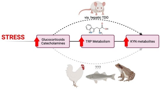 Across species, it appears that mammals, birds, and fish have similar responses to stress with respect to changes in TRP-KYN metabolism (Figure 4). Increased GC and catecholamine signaling, which are characteristic of stress responses, elevate TRP metabolism through the KYN pathway, as indicated by the levels of downstream metabolites. While it is generally accepted that this occurs through hepatic TDO induction in mammals, the molecular mechanism is not yet clear in other vertebrate species. In bird and fish species, TRP-enhanced diets have been shown to reduce stress-induced plasma GC levels and aggressive behaviours.