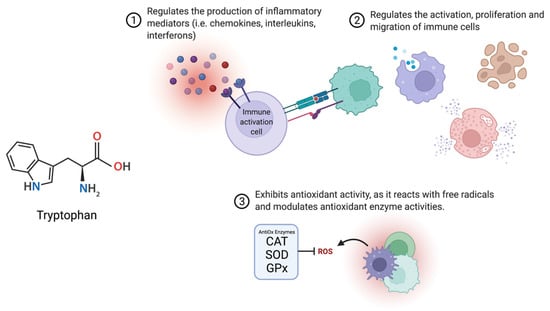 - Haq, S.; Grondin, J.A.; Khan, W.I. Tryptophan-Derived Serotonin-Kynurenine Balance in Immune Activation and Intestinal Inflammation. FASEB J. 2021, 35, e21888. [Google Scholar] [CrossRef]