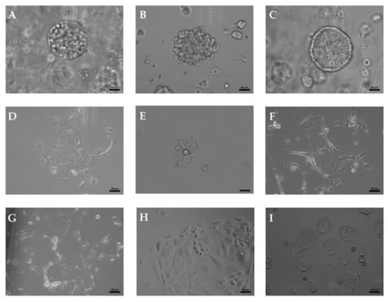 Urothelial carcinoma organoids in culture. Cells from tissue samples derived from BC patient #56 (A,D), #140 (B,E), and #147 (C,F) were expanded as organoids (A–C) or adherend 2D standard cultures (D–F). Normal urothelial cells (G) and BC cell lines HT1197 (H) and RT4 (I) served as controls. Size bars indicate 50 μm.