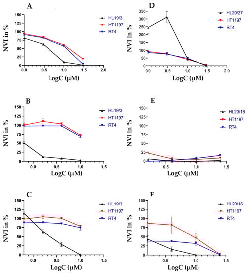 Comparing cytotoxic effects in urothelial cells in 2D cultures by two different assay types. Normal urothelial cells (NUCs HL19/3, HL20/16, HL20/27) as well as bladder cancer cell lines HT1197 and RT4 were incubated with different concentrations of CIS (A,D), VTX (B,E), S63 (C,F) to determine the cell viability after two days of incubation by either a chemiluminescence assay (CTG 2.0; A–C) or a colorimetric assay (WST; D–F). The mean normalized viability index in percent (NVI %; ordinate, Y-axis) is disclosed as function of the logarithm of drug concentrations employed (LogC; (µM), abscissa, X-axis).