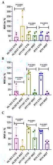 In a first series of experiments, drug responses to CIS, VTX, and S63, respectively, were explored by a chemiluminescence assay (CellTiterGlo 2.0; CTG) in direct comparison to a colorimetric assay using the water-soluble tetrazolium (WST) salt as the substrate and employing standard 2D cultures of adherent cells. To this end, NUCs and the BC lines HT1197 and RT4 were utilized. To avoid artifacts associated with cellular senescence of somatic NUCs from a single donor after extended in vitro passaging, we preferred to include early passage NUCs from three individual donors. Addition of CIS (Figure 3A,D), VTX (Figure 3B,E), or S63 (Figure 3C,F) yielded distinct dose-response curves by CTG assay after 2 days of incubation (Figure 3A–C) when compared to the WST assay (Figure 3D–F). By CTG assay, CIS was slightly more effective on NUCs when compared to the two BC lines (Figure 3A). In contrast, by WST assay, NUCs produced an artifact of a virtually high normalized viability index (NVI) in controls and at 0.5 μM CIS, but no significant difference in sensitivities at 1.0 μM CIS in comparison to HT1197 and RT4, respectively (Figure 3D). This artifact may be explained by proliferation of NUCs in the absence of CIS and under low CIS dosage over 3 days prior to the colorimetric assay. However, it was recorded only when using the WST chemistry and NUCs (Figure 3D). When using CTG assays, this effect was not observed (Figure 3A). We therefore considered this a technical artifact but not a result associated with CIS cytotoxicity. By CTG assay, NUCs were more sensitive to VTX-induced apoptosis when compared to HT1197 and RT4 cells (Figure 3B). In contrast, by WST analysis, this difference was not evident (Figure 3E). The cytotoxic effects of S63 yielded comparable results by CTG assay: NUCs were more sensitive to S63 when compared to the BC lines HT1197 and RT4 (Figure 3C). By WST analysis, the same trend was observed, but differences between NUCs and RT4 were less prominent (Figure 3F). Moreover, statistically significant differences were noted when CTG analyses of urothelial cells were compared to WST assays with the same cells (Figure 4). The artifact in the WST assays of NUCs after CIS treatment is evident here as well (Figure 4A). The NVI after CIS treatment was significantly different for the two tumor lines utilized, but the mean values remained in a comparable range (Figure 4A). In contrast, using VTX or S63 generated not only significant differences in NVI levels of all cells tested but in addition yielded eminent disparities of the means of the NVIs computed (Figure 4B,C). Table 1 summarizes these analyses. The data document showed that the colorimetric WST assay yielded quite different half maximal inhibitory concentrations (IC50) towards CIS, VTX, and S63 on NUCs, HT1197, and RT4 in standard 2D cultures after 1 to 3 days of incubation when compared to the CTG analyses employed here under otherwise identical conditions.