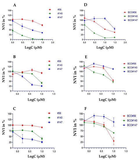 Comparing cytotoxic effects in urothelial carcinoma cells in 2D versus 3D cultures. BCOs were generated from cells of patients #56, #140, and #147 and expanded. From BCOs, cells were derived for further expansion in adherent 2D cultures (A–C) or 3D organoid cultures (D–F). The CTG chemiluminescence assay in 2D (left panel) vs. 3D (right panel) cultures was performed to compare the responses of the cells to CIS (A,D), VTX (B,E), and S63 (C,F), respectively. The mean normalized viability index in percent (NVI %; ordinate, Y-axis) is disclosed as function of the logarithm of drug concentrations employed (LogC; (µM), abscissa, X-axis).