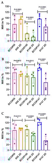 To investigate if cells in adherent 2D UC cell cultures yield distinct sensitivities to CIS, VTX, and S63 in viability assays in comparison to 3D organoid cultures, a chemiluminescence assay was employed. We assumed that absorption, ray diffraction, or reflections of the beam in an ELISA reader by organoids and Matrigel domes might bias the read-out. Therefore, analyses of cell viabilities were not performed in 3D organoids by colorimetric methods (e.g., WST assay in an ELISA reader). In contrast, to determine the cytotoxic effects and the IC50 of the components included in this study in 2D versus 3D cultures, we utilized a chemiluminescence technology (Figure 5). Adding different amounts of CIS to cells in 2D (Figure 5A) in comparison to the same cells in 3D organoids (Figure 5D) yielded overall comparable responses. Cells from patient #140 showed the highest sensitivity to this drug (Figure 5). A different response was observed upon addition of VTX. Cells from patient #147 yielded a high sensitivity towards the BH-3 mimic VTX in 2D (Figure 5B). However, in 3D organoids, these cells presented with the lowest sensitivity over the whole range of concentrations investigated (Figure 5E). This difference was also observed with S63 and cells from patient #147. The 2D cultures of cells from patient #147 responded well to S63 (Figure 4C), while in 3D organoids, BCO#147 was less sensitive (Figure 5F). In addition, statistically significant differences were recorded when the NVIs were computed after treatment of the cells with CIS, VTX, or S63 in 3D organoids vs. 2D cultures (Figure 6). A hypothesis that cells in 2D may be more sensitive to CIS when compared to the same cells in an organoid was not observed as BCO#56 yielded a significantly reduced NVI when compared to #56 cells in 2D. In contrast, for BCO#140 and BCO#147, the opposite was found (Figure 6A). Upon treatment with VTX, BCO#147 yielded a most prominent gap between the mean NVI when compared to the NVI of #147 cells in 2D, while the NVIs of BCO#56 and BCO#140 in comparison to the corresponding 2D cell were less, but still significantly, different (Figure 6B). Comparable results were obtained by S63 treatment of the same cells: A clear and significant difference in cell viabilities between BCO#147 when compared to #147 cells in 2D, and less prominent but significant differences between the NVIs of two other organoids and cells in 2D, respectively (Figure 6C).