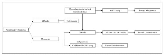 We generated organoids from urothelial tumor cells of 7 donors and selected organoids from 3 donors which granted stable growth as organoids and as adherent 2D cultures. We confirmed expression of urothelial antigens and tumor markers by immunohistochemistry and investigated the dose response curves of two novel components, venetoclax (VTX; Selleck Chemicals, Huston, TX, USA) versus S63845 (S63; Selleck Chemicals, Huston, TX, USA), in comparison to a clinical standard, cisplatin (CIS; Sigma-Aldrich Chemie, Taufkirchen, Germany), in organoids in comparison to the corresponding 2D cultures by WST and chemiluminescence viability assays. Normal urothelial cells (NUCs) and tumor lines RT4 and HT1197 (ATCC; Manassas, VA, USA) served as controls. An overview of the study design is presented in Figure 7.