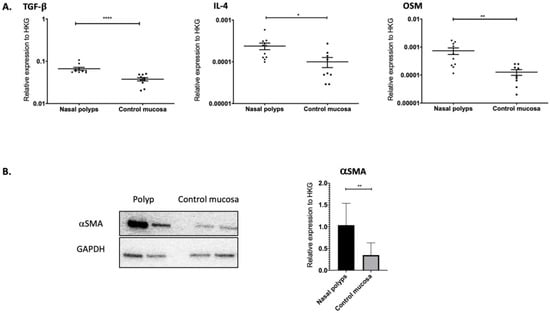 TGF-β1, IL-4 and OSM were overexpressed in nasal polyps (n = 13) when compared to noninflammatory nasal mucosa (n = 13). TGF-β1, IL-4 and OSM were analyzed by RT-qPCR using GAPDH as housekeeping gene to normalize gene expression (median) (A). αSMA was overexpressed in nasal polyps (n = 6) when compared to noninflammatory nasal mucosa (n = 6). αSMA was analyzed by Western blot using GAPDH as housekeeping gene to normalize gene expression. The image is representative of two experiments. The graph shows the relative expression of each gene compared to the expression of the housekeeping gene (HKG) (n = 6) (B). **** p < 0.0001; ** p < 0.005; * p < 0.05.