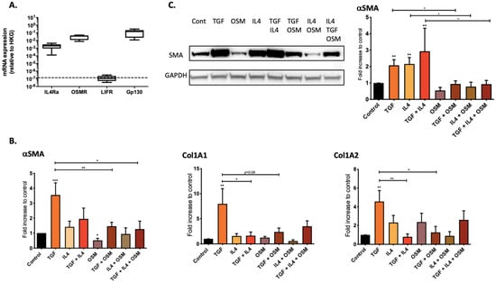 To evaluate the role of the proinflammatory cytokines IL-4 and OSM in the fibrotic process, we evaluated in vitro the expression level of genes coding for ECM components (collagen 1A1 and 1A2) and αSMA (indicator of myofibroblast transition) both at the transcriptional and protein levels in cytokine-stimulated nasal-polyp-derived fibroblasts. We first confirmed the mRNA expression of IL-4Rα1 and type II OSM receptor (composed of OSMR and gp130 chains) but not type I OSM receptor (composed of LIFR and gp130 chains) in nasal-polyp-derived fibroblasts (Figure 2A). Then, we stimulated nasal-polyp-derived fibroblasts with TGF-β1 in the presence or absence of IL-4 and/or OSM. In TGF-β1-stimulated fibroblasts, collagen 1A1 (p = 0.004), collagen 1A2 (p = 0.004) and αSMA (p = 0.0006) mRNA were overexpressed (Figure 2B), as well as at the protein level for αSMA (p = 0.002) (Figure 2C). Whereas IL-4 alone had no detectable effect on αSMA, collagen 1A1 and collagen 1A2 expressions at the transcriptional level when compared to unstimulated fibroblasts, αSMA protein expression was enhanced (p = 0.002). In contrast, IL-4 counteracted the enhancing effect of TGF-β1 on fibroblasts for collagen 1A1 (p = 0.015) and collagen 1A2 (p = 0.004) mRNA expression, but not αSMA, both at the transcriptional and protein levels (Figure 2B,C). On the other hand, OSM alone or in combination with IL-4 had no effect when compared to control. However, OSM, in combination with TGF-β1, counteracted the profibrotic effect of TGF-β1, decreasing the expression of collagen 1A1 (p = 0.093, not significant), collagen 1A2 (p = 0.041) mRNA and αSMA both at the transcriptional (p = 0.015) and protein levels (p = 0.0260) (Figure 2B,C).