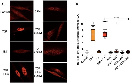 To further analyze the effects of OSM and IL-4 on nasal-polyp-derived fibroblasts at the cell signaling level, we studied their potential impact on Smad3 nuclear translocation induced by TGF-β1. Nasal fibroblasts were stimulated with TGF-β1, IL-4 or OSM, alone or in combination. Nuclear or cytoplasmic localization of Smad3 was determined by immunofluorescence and quantified. In TGF-β1-stimulated fibroblasts, the nuclear/cytoplasmic ratio of Smad3 was greater than in unstimulated fibroblasts (p < 0.0001) and further addition of IL-4 had no effect. In contrast, OSM reversed the nuclear translocation induced by TGF-β1 (p < 0.0001), and the addition of IL-4 to these conditions had no effect (Figure 3).