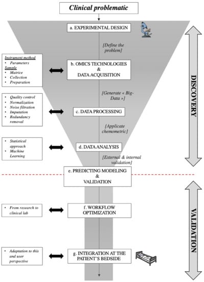 Figure 1, b: Defining the molecular investigation technology, next-generation sequencing, microarray, or mass-spectrometry, the major omics platforms have distinct limitations in sampling and instrumental methods that must be taken into account. Human sample collection, storage, and preparation are also critical issues, aiming at limiting internal degradation of target molecules while remaining compatible with a clinical setting. This may involve the use of stabilizer reagents (for instance, with RNA) or of pre-analytical steps such as deprotonation (for instance, with metabolomics). In terms of the instrumental method, optimal parameters selection is laborious: on the one hand, the industrial sector offers a large catalog of these tools; on the other hand, the adjustment is conditioned by the (often partial) researcher’s knowledge and the literature. To date, no consensus defines an efficient configuration []; hence, the need for lab-specific optimization is unavoidable.