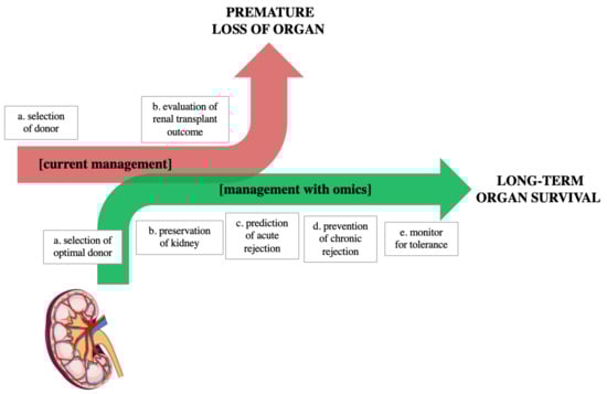 New perspective on renal transplant management. The arrows show the current management (red arrow) and future potential management (green arrow) adopted for kidney transplantation. Current management includes two steps: (a) Donor–Recipient pairing, based on evaluation of donor variables and organ quality. To help clinicians in allocation, the Kidney Donor Profile Index (KDPI) score can be used. (b) After kidney transplantation monitoring, using kidney biopsy and creatinine level. However, such parameters cannot apprehend the complete phenotype of a patient and can lead to premature loss of organs. Future management with omics: to improve quality of care in patients, omic approaches (i.e., genomics, transcriptomics, proteomics, and metabolomics) can be implemented through several steps: (a) selection of optimal donor with the addition of omics-based predictive tools to common clinical parameters; (b) preservation of kidney, which can be tailored to the need of the organ based on an in-depth understanding of the organ (through omics data at the donor level) and through real-time monitoring of the perfusate; (c) post-transplant monitoring and prediction of acute rejection; throughout the life of the organ, graft management through bioinformatics could improve clinical practice; and (d) prevent chronic graft loss; and (e) monitor for tolerance. Figure adapted from reference [].