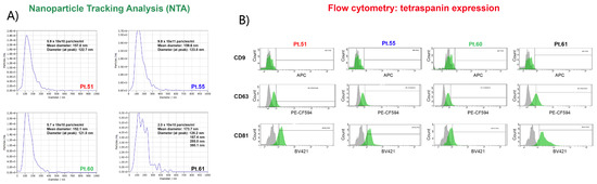 (A) EV NTA analysis shows very similar profiles in terms of EV populations detected in all patient samples but reveals a very peculiar nanoparticle distribution for Pt# 61, which may deserve further investigation. (B) Expression of typical EV markers CD9, CD63, and CD81 evaluated by flow cytometry on a BD FACS Aria. (Upper panel) The expression of CD9 was almost absent in EVs consistently in all four patients; (middle panel) CD63 was detected in a comparable percentage in Pt#51, Pt#55, and Pt#60, while for Pt#61, it shows an almost double expression; (lower panel) EVs presented a similar expression of CD81 in Pt#51, Pt#55, and Pt#61 samples, while in Pt#60, it presented a lower expression. Some like 2.0E+5 mean 2.0 × 105.