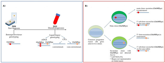Case of Pt#55. (A) Timeline of mutational assessment; (B) Hypothesis of the clonal evolution of the disease: the different mutations detected in CTCs may reflect tumor heterogeneity.