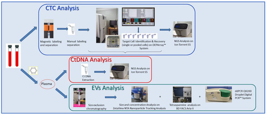 Schematic representation of the parallel analytical workflows performed for ctDNA, CTC, and EV analyses.