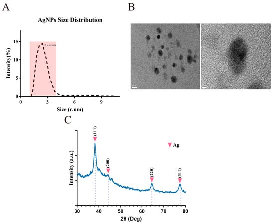The size and structure of AgNPs determines their antiviral properties. BSA-AgNPs that were prepared in one step by the hydrothermal method present a more stable status and smaller particle size distribution regarding their physical properties. We synthesized AgNPs by using BSA as a reducing and protecting agent, and then further analyzed and tested their general properties. The TEM observations suggested that the shape of AgNPs as synthesized by BSA-AgNPs was approximately spherical, with BSA wrapped around the AgNPs core and with a relatively consistent diameter of 2–4 nm (Figure 1B). Meanwhile, dynamic light scattering (DLS) was used to calculate the size distribution of AgNPs. The analysis indicated that the size range of synthesized BSA-AgNPs was concentrated at 2–4 nm (Figure 1A). XRD patterns represent the solid phase structure and crystallinity; the four peaks of the XRD pattern were located at 2θ values of 38.1°, 46.18°, 64°, and 78.08°, corresponding to the 111, 200, 220, and 311 Bragg’s reflection, respectively, (Figure 1C), confirming the crystalline nature of AgNPs.