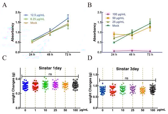 The optimum concentration of AgNPs in vivo and in vitro. Different concentrations of AgNPs fed the 5th instar larvae. Cell viability was examined using CellTiter 96 aqueous solution at low (A) and high (B) concentrations of AgNPs. Statistics of larvae weight after one (C) and three (D) days of feeding different concentrations of AgNPs-treated mulberry leaves. Different colors indicate different parallel groups. Differences in data were assessed by t-test, ns p > 0.05.
