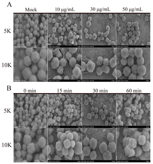 To study the effect of AgNPs on BmNPV, the morphological characteristics of BmNPV after treatment with different concentrations of AgNPs were observed by SEM. The BmNPV untreated by AgNPs were arranged regularly and exhibited a polyhedral structure of 2–4 μm in diameter (Figure 3A). The BmNPV was treated with AgNPs at concentrations of 10, 30, and 50 μg/mL for 30 min (Figure 3A). The viral envelopes began to break down, and the smooth viral surface gradually became rough; as the concentration increased, the degree of dissociation of the envelope increased significantly. We further performed a time-course study to explore the interactions between AgNPs and BmNPV. As in the initial experiment, the BmNPV showed gradual morphological changes over time at a concentration of 50 μg/mL. In the early stages, AgNPs treatment caused the polyhedrin protein to become loose; after one hour, many BmNPV had been cleaved, and the viral structure was substantially disrupted (Figure 3B).