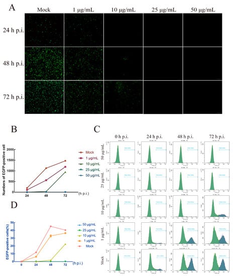 The higher concentrations of AgNPs could destabilize the envelope structure of BmNPV. Further analysis considered the effect of AgNPs on BmNPV multiplication. BmNPV was treated with AgNPs at various concentrations for various durations, and the rates of BmNPV multiplication were measured via enhanced GFP fluorescence generated by EGFP-expressing recombinant baculovirus (Figure 4A). After the EGFP-positive (EGFP+) cells were counted in the graph (Figure 4B), we quantified the rate of viral multiplication with flow cytometry (Figure 4C). In the 1 μg/mL concentration group, the number of EGFP signals was significantly lower than in the control at 24 h post-infection. The EGFP+ cell numbers also were significantly below those of the untreated group. At subsequent time points, the multiplication rate of BmNPV was slightly inhibited, while the EGFP signal began to emerge in the 10 μg/mL concentration group. Many EGFP+ cells were detected at 72 h post-infection. In addition, no fluorescence signal was observed in the higher-concentration groups, indicating that the virus could not infect cells and multiply in this higher-concentration range.