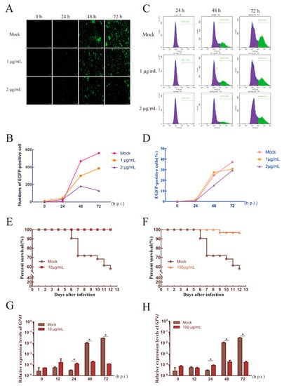 The results for the survival rate of silkworms showed the following outcomes. When the silkworms were infected by the untreated virus, there was massive silkworm mortality in the fifth and sixth days of infection. The final survival rate was 56.67%. There were no deaths in either treated group during the same time, and the survival rate of both groups was above 96% on the final day (Figure 5E,F). Based on the above treatment, we obtained silkworm samples after 0, 12, 24, 48, and 72 h post-infection, and the relative expression levels of the GP41 gene were evaluated by RT-qPCR (Figure 5G,H). The results showed that the relative expression levels of GP41 of both treatment groups were significantly lower than those of the untreated group at 48 h after infection. Curiously, the gene expression of the treated group was slightly higher than that of the untreated group, but the expression after that point was maintained at a low level.