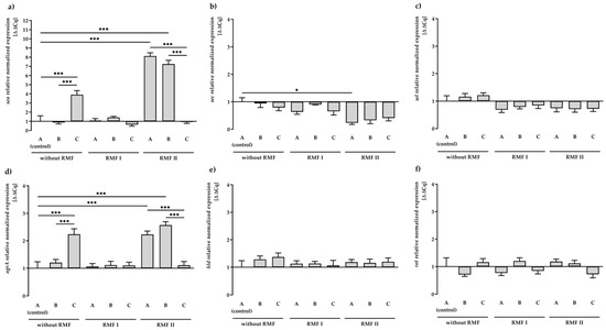 Relative expression levels of SEs: sea (a), sec (b), and sel (c) and regulatory: agrA (d), hld (e), rot (f) genes in S. aureus FRI913 grown on Mueller–Hinton agar non-supplemented with trans-anethole (A), supplemented with 1% (v/v) Tween 80 (B), and supplemented with 1% (v/v) Tween 80 and subinhibitory concentration of trans-anethole (C), exposed to rotating magnetic fields (RMFs: RMF I: 5 Hz, RMF II: 50 Hz) and unexposed (without RMF). Control—bacteria cultured on a medium non-supplemented with trans-anethole (A) and unexposed to RMF. Data are shown as the mean ± standard deviation. * p < 0.05; *** p < 0.001.