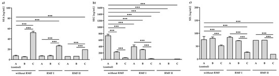 As shown in Figure 1a, transcription of the sea gene did not differ statistically significantly between RMF of 5 Hz and unexposed control settings. In contrast, a significant increase (p < 0.001) in the sea gene expression (approx. 8-folds) was found due to exposure to the RMF of 50 Hz. Similarly, a significant increase (p < 0.001) in gene expression of sea, compared to the control (medium A unexposed to RMFs), was observed when bacteria were incubated on a medium with TA (approx. 4-folds). Nevertheless, the presence of RMF of 50 Hz and TA contributed to a significant decrease (p < 0.001) in the transcript level of sea. It was also found that the exposure to RMF (both frequencies) decreased the expression level of sec and sel genes (Figure 1b,c). However, in this case, only exposure to the RMF of 50 Hz resulted in significant changes (p < 0.05) in gene expression of sec in comparison to the control.