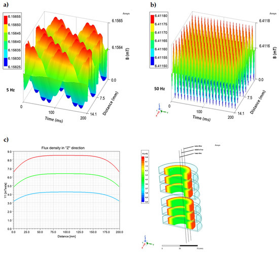 Changes in the magnetic flux characteristics depending on the applied AC frequency: (a) 5 Hz; (b) 50 Hz, and (c) spatial distribution of magnetic field in a cross-section (h = 20 cm) of RMF-bioreactor in the outer, middle, and inner zone from which bacteria were harvested for individual analyses.