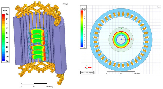 The design of the RMF generator was based on a three-phase, four-pole stator with an internal diameter of 16 cm and a height of 20 cm, consisting of twelve groups of three coil sets (Figure 4). The frequency of the alternating current (AC) provided to the RMF generator was regulated using a Unidrive M200 inverter (Control Techniques, Nidec Industrial Automation, Poznan, Poland). The temperature in the RMF reactor chamber was controlled using a water thermostat (KISS K6, Huber, Germany) equipped with a set of temperature probes (accuracy range ± 1.0 °C). The distribution of magnetic induction (B) in the reactor chamber was performed at an initial voltage of AC of 100 V and AC frequencies of 5 Hz and 50 Hz using the Ansys Maxwell simulation software ver. 19.1 (Ansys, Inc., Canonsburg, PA, USA) and using a teslameter (SMS-102, Asonik, Tuczno, Poland).