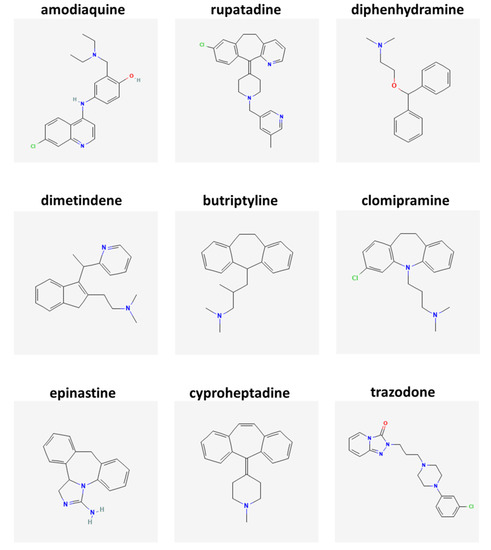 Chemical structures of histamine candidate drugs repurposable for multiple sclerosis. The figure shows the chemical structures of the best selected histaminergic modulators that are identified by SAveRUNNER/GSEA algorithm as repurposable drugs for multiple sclerosis. 2D chemical structures were retrieved from https://pubchem.ncbi.nlm.nih.gov/ (accessed on 12 May 2022).