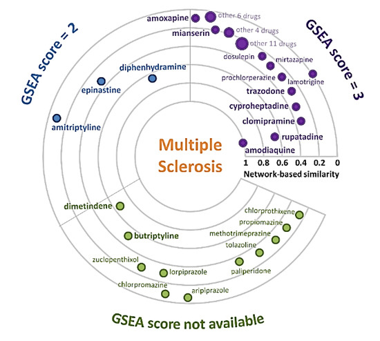 Another important issue that emerges from the present work is what we can further learn by applying the SAveRUNNER/GSEA algorithm to different diseases, such as MS (the present work) compared to ALS, for instance [33]. Although sharing certain aspects of neuroinflammation, demyelination, neurodegeneration and muscle atrophy, eliciting cellular damage primarily in brain, spinal cord, and muscles, and finally causing similar symptoms such as fatigue, muscle spasms, inability to move, and, last but not least, sharing the lack of an available cure, MS and ALS have more differences than similarities. This dichotomy is also evident from SAveRUNNER/GSEA analysis. Undoubtedly, the H1 receptor antagonist clomipramine that emerges as a good candidate to be repurposed for MS, with good similarity value and GSEA score, confirms its repurposable potential previously also demonstrated against ALS [33]. However, the H1 antagonists mianserin (network-based similarity value = 0.2234, p-value = 0.0109, GSEA score = 3) and amoxapine (network-based similarity value = 0.0198, p-value = 0.0338, GSEA score = 3) that are ranked quite low in the MS druggable scale were previously demonstrated to be very promising ALS repurposable drug candidates (with network-based similarity values of 0.92 and 0.89, respectively) [33]. Finally, modafinil, which was identified by SAveRUNNER/GSEA analysis with the highest score of network similarity among the SAveRUNNER-predicted drugs for ALS [33], is not even considered a druggable target for MS. This confirms not only the reliability but also the disease-selectivity of the network medicine approach implemented through our algorithm applied to MS.