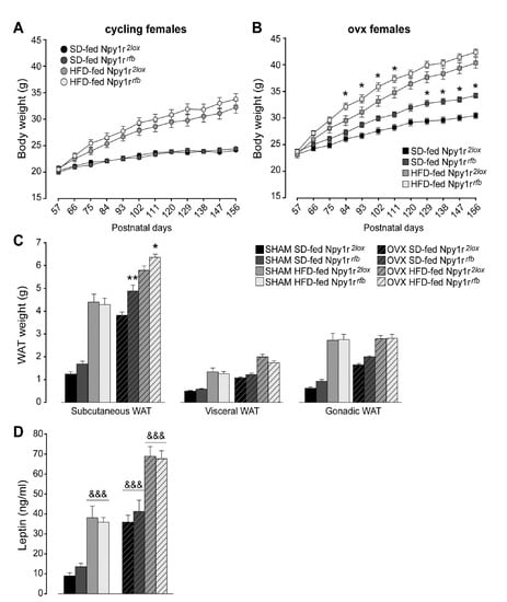 Body weight of standard diet (SD)- and high-fat diet (HFD)-fed cycling (A) and ovx (B) Npy1r2lox control and Npy1rrfb knockout female mice. No significant differences in body weight growth were observed between cycling Npy1r2lox and Npy1rrfb female mice during postnatal days (P) 57–156, independently of diet regimen. SD- and HFD-fed ovx Npy1rrfb females displayed a significantly greater body weight compared with their control littermates on the same diet regimen. Data are the mean ± SEM; n = 17–26 from 6 litters. * p < 0.05 versus the corresponding control females. (C) Adiposity of standard diet (SD)- and high-fat diet (HFD)-fed cycling and ovx Npy1r2lox control and Npy1rrfb knockout female mice. Significantly larger depots of subcutaneous fat were observed in ovx Npy1rrfb females compared with their control littermates on the same diet regimen. Data are the mean ± SEM; n = 10–15 from 3 litters. ** p < 0.01 and * p < 0.05 versus SD-fed and HFD-fed ovx Npy1r2lox female mice, respectively. (D) Leptin plasma levels of standard diet (SD)- and high-fat diet (HFD)-fed cycling and ovx Npy1r2lox control and Npy1rrfb knockout female mice. Both ovariectomy and HFD increased leptin plasma levels of female mice. Data are the mean ± SEM; n = 10–15 from 3 litters. &&& p < 0.001.